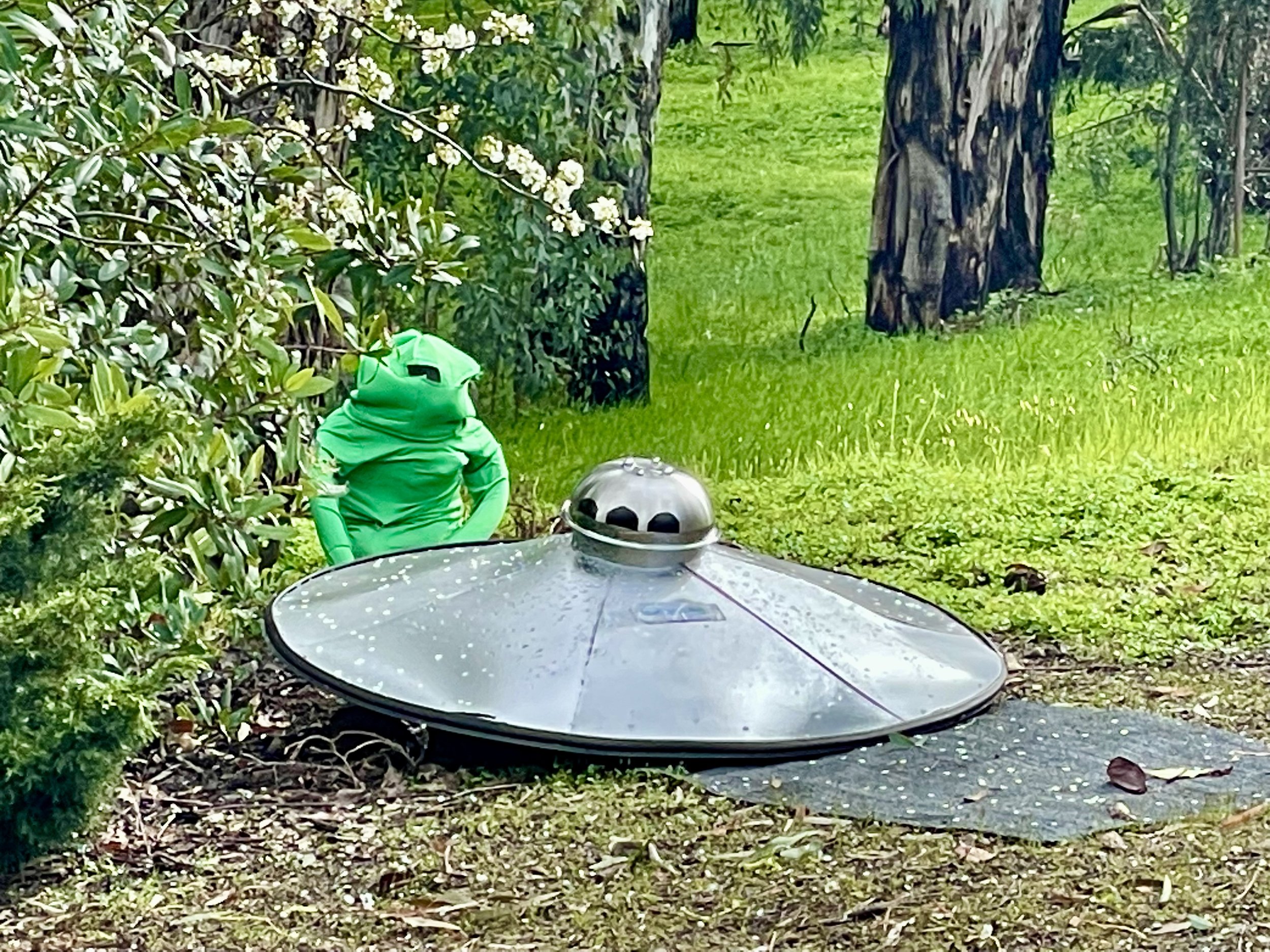 “Happy Saint Patrick’s Day,” said the little green man behind his Shiny Silver UFO. As I stared at it in disbelief he said: “I may be otherworldly but I celebrate St. Patty Day too.” Okay, I kissed the Blarney Stone one too many times. The true story-so help me God-is retired commercial airline pilot named Bob placed this on the front of his green lawn in our gated community for the neighbors to see for the sole purpose of making us smile. Thank you Bob for placing a new installation on your lawn for each holiday.