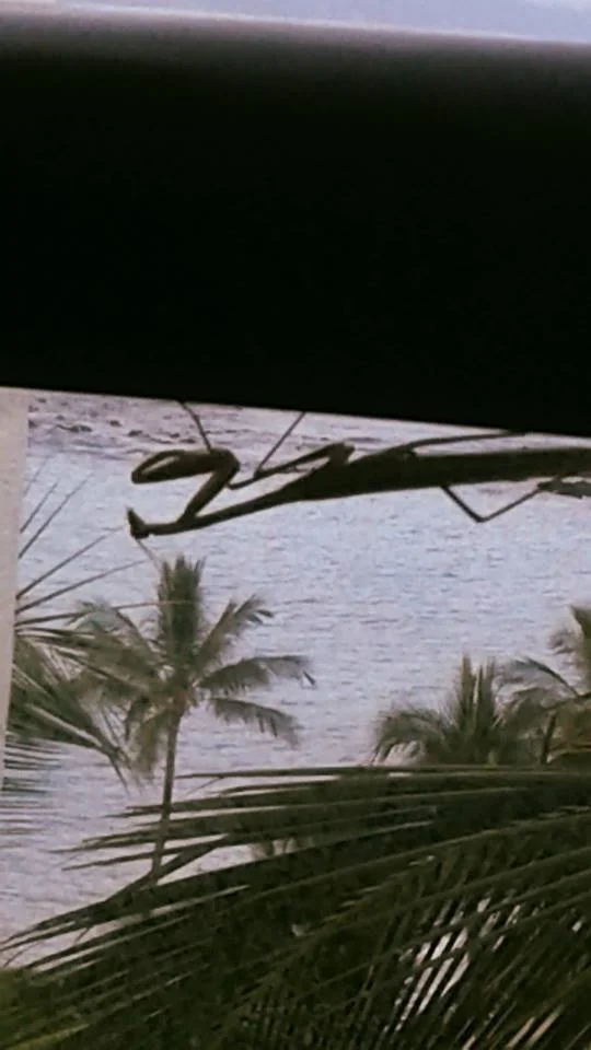 While sitting out on our lanai on the 8th floor at the Wailea Marriott Resort overlooking the ocean in Maui, I noticed a Praying Mantis, measuring approximately five inches long. It had positioned itself upside down on the handrail of the glass enclosure like a shadow of itself. It was sitting as still as a Buddhist monk in meditation. I got closer to photograph it. Its’ patience and one pointed focus was amazing. Though sitting motionless, it slowly turned its alien like head keeping me directly in its’ gaze. The praying hands of a Praying Mantis have little to do with religiosity, and more to do with the rows of sharp spines at the end of its front legs that shoot out to grasp its’ prey (tiny insects).